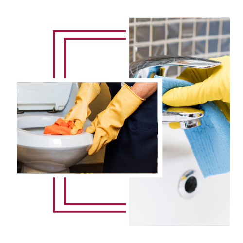 Cleaning and sanitising toilets, urinals, basins, and washroom surfaces.